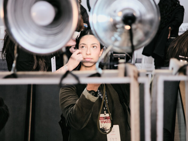 Las manos de estilistas y maquilladores se mueven con precisión quirúrgica, creando identidades completas en cuestión de minutos. Cada modelo es transformada en un lienzo vivo, donde color, luz y textura se mezclan para construir un personaje que llevará la visión del diseñador frente al público. Los equipos de maquillaje y peinado trabajan como una red invisible: sostienen, corrigen, reimaginan y acompañan. Son el pulso constante detrás de cada salida.
